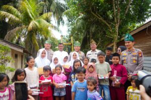Dalam rangkaian kegiatan tersebut, Kapolda Riau juga menyerahkan bantuan berupa buku tulis dan alat tulis kepada anak-anak sekolah di Desa Muara Petai sebagai bentuk kepedulian terhadap dunia pendidikan.